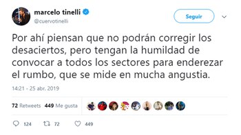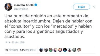 Algunas horas después, el conductor volvió a referirse al tema en otros dos tuits. Primero pidió que quienes integran la cúpula del gobierno "dejen de hablar con el 'consultor' y con los 'mercados' y hablen con y para los argentinos angustiados y asustados". En esa línea, agregó que "por ahí piensan que no podrán corregir los desaciertos, pero tengan la humildad de convocar a todos los sectores para enderezar el rumbo, que se mide en mucha angustia".