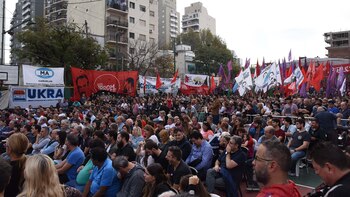 En uno de los sectores del club Ferrocarril Oeste, en el barrio porteño de Caballito, las agrupaciones "Los Irrompibles" y el Movimiento Nacional Alfonista (MNA) ocuparon el rol de anfitriones. Desde las 15, centenares de militantes llegaron al estadio para escuchar los discursos de sus dirigentes.