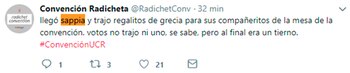 Los radicales no son lo que eran. Son un partido centenario, pero los principales dirigentes tienen sus propias cuentas de Twitter. Y también le salió a la convención nacional una cuenta en chiste, @RadichetConv o Convención Radicheta que se ríe de ella misma (tuit fijado: "somos trending tópicos en todos los grupos de WhatsApp de la UCR"), mientras tira buena información de las novedades sobre el encuentro que se realizará a partir de las 14 en Parque Norte.