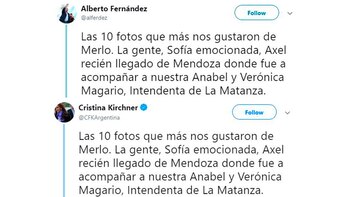 En el Patria y acuerdo mediante, hubo tuit simultáneo desde la cuenta de cada uno de los Fernández con las diez fotos que más les gustaron del acto el sábado en Merlo. Fue una hora después de la llegada de Insaurralde.
