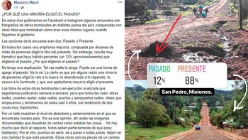 En una publicación en las redes sociales titulada "¿Por qué una minoría eligió el pasado", Macri contó que en los últimos días se publicaron en Facebook e Instagram encuestas con fotos de obras terminadas en distintas partes del país "comparadas con otras fotos que mostraban cómo eran esos mismos lugares cuando llegamos al gobierno".