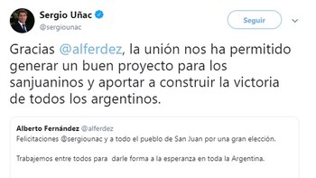 A las pocas horas, Uñac le agradeció el mensaje y agregó: "La unión nos ha permitido generar un buen proyecto para los sanjuaninos y aportar a construir la victoria de todos los argentinos".