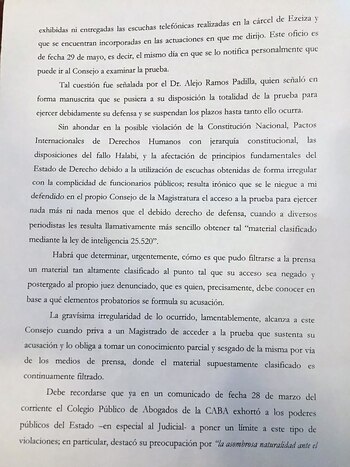 Ramos Padilla añadió: "Habrá que determinar urgentemente cómo es que pudo filtrarse a la prensa un material tan altamente clasificado al punto tal que su acceso se ha negado y postergado al propio juez denunciado que es quien, precisamente, debe conocer en base a qué elementos probatorios se fórmula su acusación".