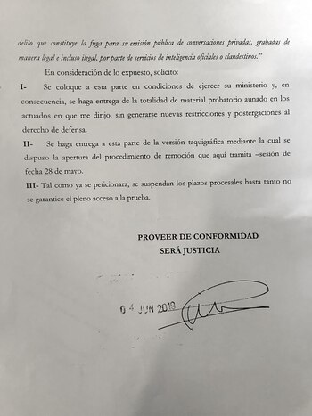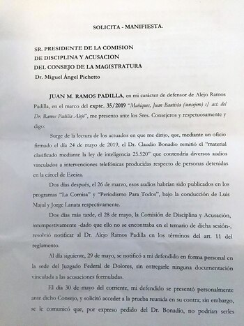 Ramos Padilla reclamó que se le pusiera a su disposición "la totalidad de la prueba para ejercer debidamente su defensa y se suspendan los plazos hasta tanto ello ocurra". En su nota a Pichetto, la defensa de Ramos Padilla planteó que "resulta irónico que se le niegue a su defendido en el propio Consejo de la Magistratura el acceso a la prueba para ejercer nada más y nada menos que el debido derecho de defensa cuando a diversos periodistas les resulta llamativamente más sencillo obtener tal material clasificado mediante la ley de inteligencia 25.520". Se quejó así de tener que conocer en una forma "parcial y sesgada" la prueba en su contra "por vía de los medios de prensa donde el material supuestamente clasificado es continuamente filtrado".