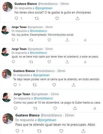 A partir de ese momento, el médico replicó con una catarata de mensajes insultantes. "Afeitate Tesán, das pena", sostuvo Blanco. Paradójicamente, el funcionario del área de Salud continuó con burlas discriminatorias, basadas en su peso. "No creo Tesán, tenés que bajar de peso también. Debés tener mal tus análisis", afirmó. El vecino replicó: "¿Cómo saberlo? Si varios de los valores que pidió el doctor de la salita del Faro no se pudieron hacer porque no había reactivos. Un poco alto el colesterol malo nomás".
