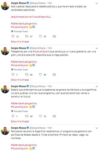 Un dato llamativo de esta serie de mensajes es que ya no cuentan con el hashtag #Hayalternativa, que hasta ayer acompañaba todas sus publicaciones. Un indicio más de que, dentro de la estrategia del tigrense, el espacio Alternativa Federal formaría parte del pasado.