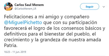"Felicitaciones a mi amigo y compañero Miguel Ángel Pichetto, que con su participación favorecerá el logro de los consensos básicos y definitivos para el bienestar del pueblo, el crecimiento y la grandeza de nuestra amada Patria", expresó en su cuenta de Twitter.