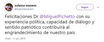 "Felicitaciones doctor, Miguel Ángel Pichetto. Con su experiencia política, capacidad de diálogo y sentido patriótico contribuirá al engrandecimiento de nuestro país", redactó Zulemita en su cuenta personal.