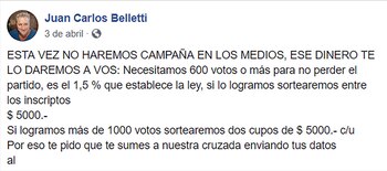Juan Carlos Belleti es precandidato para concejal por la lista "Unidad, Vida y Valores". En su cuenta personal del Facebook anunció que no haría campaña en los medios de comunicación y que elegiría un método de clientelismo directo, y para velado, con los votantes.
