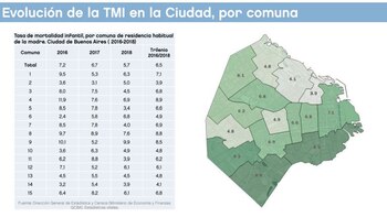 No obstante, la diferencia entre el norte y el sur de la ciudad sigue siendo una asignatura pendiente. En la comuna 4 (Barracas, La Boca, Nueva Pompeya y Parque Patricios) y en la comuna 8 (Villa Soldati, Villa Lugano y Villa Riachuelo) las tasas de mortalidad infantil del trienio fueron de 8,9 y 8,8, respectivamente. Más del doble que en la comuna 2 (Recoleta), que tuvo 3,9; la comuna 14 (Palermo), que registró 4,1; y la comuna 13 (Belgrano, Núñez y Colegiales), con 4,8.