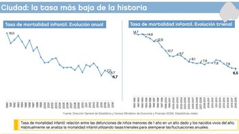 En ambos casos se trata de los mínimos históricos. En 2018, el territorio porteño registró una tasa de mortalidad infantil de 5,7 por cada mil nacidos vivos, mientras que la provincia de Buenos Aires fue de 8,9. A nivel nacional, la mortalidad infantil se redujo en forma constante todos los años (a excepción de 2007) desde 16,8 en 2002 a 9,3 en 2017.