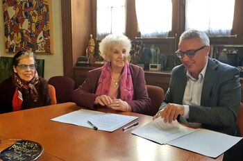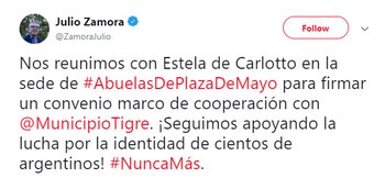 En su cuenta de Twitter, el intendente destacó el encuentro con Carlotto y, al respecto del convenio firmado, publicó: "¡Seguimos apoyando la lucha por la identidad de cientos de argentinos! #NuncaMás".