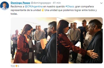 La precandidata a vicepresidenta por el Frente de Todos, la senadora Cristina Fernández de Kirchner, llegó este viernes a Resistencia, Chaco, para la presentación de su libro Sinceramente. Fue recibida por el gobernador Domingo Peppo y el intendente de la ciudad, Jorge Capitanich, en medio de la disputa entre ambos por la candidatura peronista a la Gobernación de la provincia.