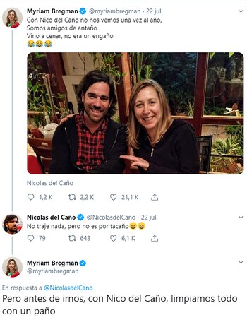 "Con Nico del Caño no nos vemos una vez al año. Somos amigos de antaño. Vino a cenar, no era un engaño", dijo la aspirante a diputada, parafraseando la insólita música. "No traje nada, pero no es por tacaño", replicó el precandidato a presidente. La conversación registró más de 30 mil favs cómplices en Twitter.
