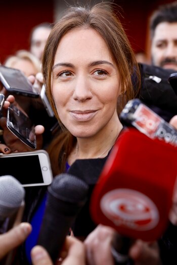 Puntualísima, a las 10.15, como había sido anunciado por su equipo de campaña,y previo a enviarle un mensaje por WhatsApp al presidente Mauricio Macri para desearle un buen día, la gobernadora y candidata arribó sin sus hijas al colegio Parroquial Don Bosco, en Castelar. El recinto lucía a esa hora casi vacío de votantes, pero atestado de cámaras y periodistas, ordenados como en una coreografía frente a la mesa de votación, según la disposición del equipo de comunicación de la gobernadora. Eso ayudó a contener el alboroto.