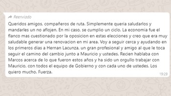 "Recién hablaba con Marcos (Peña) acerca de lo que fueron estos años -concluye el mensajes de whatsapp del ya ex ministro, con cierta nostalgia anticipada- y ha sido un orgullo trabajar con Mauricio, con todo el equipo de Gobierno y con cada uno de ustedes".