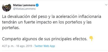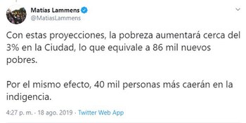 El candidato a jefe de Gobierno porteño por el Frente de Todos, Matías Lammens, realizó esta tarde un análisis sobre cómo la crisis económica afectará a la Ciudad de Buenos Aires y lo hizo a través de su cuenta personal de Twitter, a una semana de obtener el segundo lugar en las PASO.