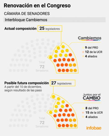 En el Senado, hoy Cambiemos tiene 25 legisladores: 12 de la UCR, 9 del PRO y 4 aliados. Si los resultados de las generales replican los del 11 de agosto, podría aumentar en dos bancas su representación: pasaría a 27, con 15 radicales, 8 del Pro y 4 aliados.