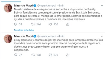 El mandatario se expresó a través de una publicación en redes sociales: "Estoy alarmado y conmovido por los incendios en la Amazonia brasileña. Los incendios devastadores en la principal reserva de oxígeno de la región nos duelen, nos preocupan y hacen que sea urgente ofrecer nuestra cooperación".