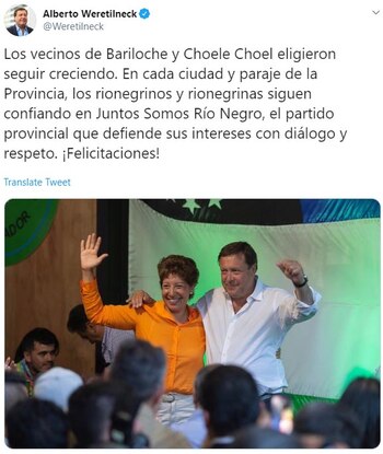 Al respecto, en su cuenta de Twitter, Alberto Weretilneck -quien apuesta en octubre a ser electo senador nacional- manifestó: "En Bariloche también seguimos creciendo juntos: felicitaciones intendente Genusso por el triunfo en las elecciones municipales, ¡Vamos Juntos, vamos Río Negro!".