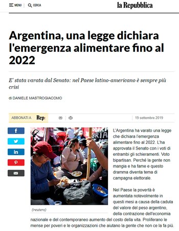 La Reppublica de Italia fue otro de los medios europeos que dieron cuenta de la Emergencia Alimentaria en la Argentina.