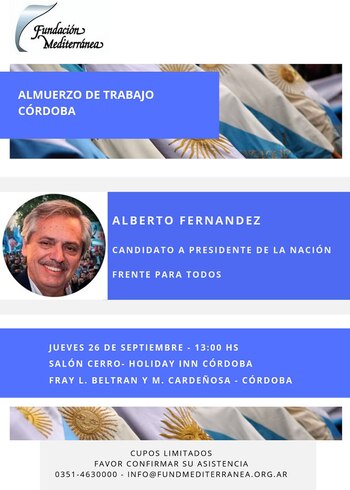 La agenda roja de Alberto Fernández tiene marcado un almuerzo nada menos que con la Fundación Mediterránea en Córdoba el jueves 26. Volverá a la provincia tras su charla reservada con Juan Schiaretti en busca de la confianza de los empresarios e industriales y del 'círculo rojo'. La Fundación invitó en marzo a Roberto Lavagna, pero canceló hace pocos días la celebración de su aniversario institucional a la que estaban invitados Mauricio Macri y su compañero de fórmula Miguel Angel Pichetto.