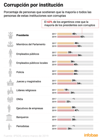 La cifra es aún más alta en nuestro país, donde el 63% cree que la institución más corrupta es la Presidencia de la Nación, un 20% más que hace dos años, cuando aún no había estallado a la ex presidenta la “causa de los cuadernos”, que involucró directamente a los ex mandatarios Néstor y Cristina Kirchner en un sistema de cobro de coimas a empresarios para conseguir contratos con el Estado. La ex jefa de Estado enfrenta 13 procesamientos en expedientes vinculadas a actos corruptos durante sus dos mandatos, media docena de los cuales están en instancia de juicio oral. Y quien fuera su vicepresidente, Amado Boudou, está preso y condenado a 5 años y 10 meses de prisión en la causa de la ex imprenta Ciccone por cohecho y negociaciones incompatibles con la función pública.