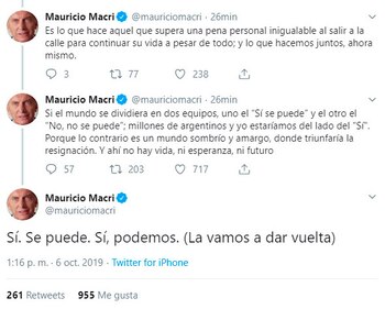 Bajo el título “EL PODER DEL ‘SÍ’" (con mayúsculas), Mauricio Macri escribió en su cuenta de Twitter: “Esta fue una de las semanas más emocionantes de mi vida. Desde el sábado 28 cuando comenzó La Marcha, cientos de miles de personas en distintas ciudades nos acompañaron para expresar públicamente su confianza”.