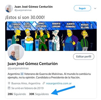 Luego de participar del segundo debate presidencial, Juan José Gómez Centurión volvió a provocar con una polémica publicación en torno a los desaparecidos de la última dictadura militar. El candidato del Frente NOS celebró la cantidad de seguidores que alcanzó en su cuenta de Twitter: “¡Estos sí son 30.000!”.