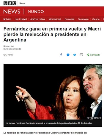 El periódico británico destacó el triunfo de Fernández como el segundo artículo más importante de su edición digital en la mañana del lunes, por detrás del anuncio del aplazamiento del Brexit. “Macri fuera, Cristina Fernández de Kirchner regresa al gobierno como vicepresidenta”, tituló. Además, calificó el hecho como un “dramático retorno”.