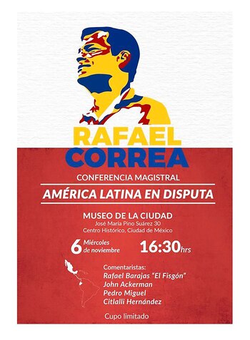 Correa, quien mantiene fuertes lazos con el régimen venezolano encabezado por Nicolás Maduro, tiene previsto dar este miércoles una charla en el Museo de la Ciudad, bajo un título intimidante a tono con su postura más combativa: “América Latina en disputa”.
