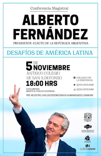 La charla será a las 18. La organización de este evento está a cargo del Programa Universitario de Estudios sobre Democracias, Justicia y Sociedad de la UNAM. Fernández también tiene planeado otorgar una entrevista para un programa de televisión de la universidad nacional, que la realizará el propio director del programa universitario John Ackerman.