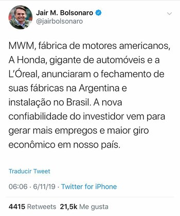 Pero el presidente Bolsonaro decidió revisar su propia postura y demostrar que la decisión de quien habrá de representarlo la debe tomar él mismo. La designación de “un ministro” representa, de hecho, disminuir la categoría de la representación brasileña. A todo esto, el presidente Bolsonaro decidió manifestar una vez más la intensidad de sus disgustos con el rumbo que Argentina tomará a partir de la presidencia de AF. Hoy publicó un Twitter resonante donde anticipaba que tres grandes empresas se retirarían del país, por temor al futuro plan económico. Las empresas en cuestión desmintieron esa versión y el tuit de Bolsonaro fue borrado una hora después de publicado.