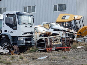 Apenas uno aterriza en Río Gallegos, sale del aeropuerto, gira en una curva para el ingreso a la autovía que los trasladará a la capital santacruceña, y todo está ahí, a la vista. Se ve. Se impone. Miles de metros cuadrados de chatarra acumulada, solo protegida por un alambrado débil y dos garitas, una de ellas bloqueada por carteles viejos de señalización vial. Parece una imagen de un lugar sacado de Chernobyl.