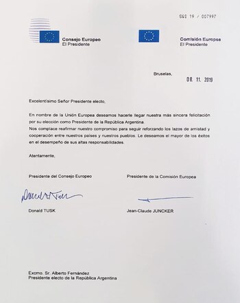 Antes de comenzar el almuerzo, la embajadora Maio-Coliche le entregó una carta a Fernández del presidente del Consejo Europeo Donald Trusk y el presidente de la Comisión Europea Juan Claude Junker en la que lo felicitaron por el triunfo electoral y se mostraron dispuestos a “reforzar los lazos de amistad y cooperación entre nuestros países y nuestros pueblos”, Y le desearon “el mayor de los éxitos”.