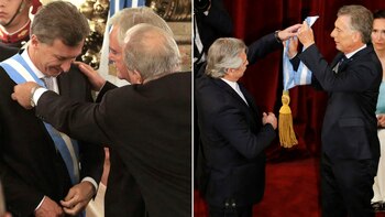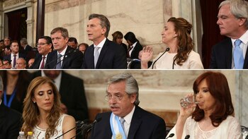 Hoy, cuatro años después, el escenario fue completamente distinto. Macri decidió respetar el protocolo y presentarse en el Palacio Legislativo, tal cual lo pidió el presidente electo. Saludó con un cálido abrazo al nuevo jefe de Estado y con un frío apretón de mano a la flamante vicepresidenta. Luego, procedió a colocarle la banda y entregarle el bastón de mando a Alberto Fernández. Trató de contener la sonrisa y apeló a gestos de mesura.
