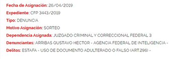 El 26 de abril de 2019, Gustavo Arribas, quien ocupó la dirección de la Agencia a Federal de Inteligencia durante el gobierno de Mauricio Macri, hizo una denuncia por el delito de uso de documento falso o adulterado.