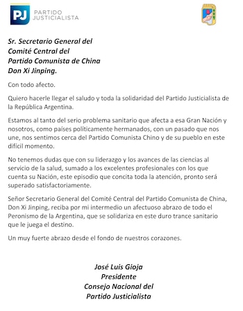 “Con todo afecto. Quiero hacerle llegar el saludo y toda la solidaridad del Partido Justicialista de la República Argentina. Estamos al tanto del serio problema sanitario que afecta a esa Gran Nación y nosotros, como países políticamente hermanados, con un pasado que nos une, nos sentimos cerca del Partido Comunista Chino y de su pueblo en este difícil momento”, arranca la misiva que lleva la firma de José Luis Gioja, presidente del PJ.