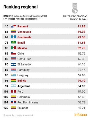 En tanto, Argentina se ubica en el puesto 94 del ranking global, y en el 12 en el latinoamericano con 54,98 puntos de opacidad financiera, por debajo de la media global (64 puntos) y de la media regional (62).