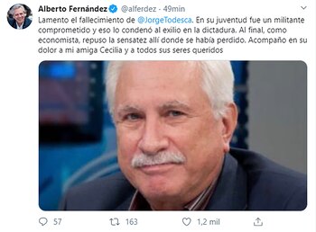 “Lamento el fallecimiento de @JorgeTodesca. En su juventud fue un militante comprometido y eso lo condenó al exilio en la dictadura. Al final, como economista, repuso la sensatez allí donde se había perdido”, tuiteó Alberto Fernández, en alusión a las estadísticas que no informaban con veracidad sobre la inflación, la desocupación y la pobreza.