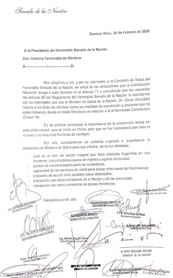 Según la carta, la cita es para que el ministro explique “cuál es el plan de acción integral que lleva adelante Argentina en sus fronteras, sus principales pasos de ingreso y egreso de turistas, las alertas de concientización para los ciudadanos, la capacidad de los servicios de salud para actuar ante eventuales casos, el protocolo de acción, la interacción con otros ministerios y las provincias y la interacción con países fronterizos".