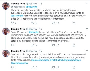 Sin embargo, al término del discurso, el ex secretario de Derechos Humanos, Claudio Avruj, salió a desmentir a Alberto Fernández y se puso a disposición para brindarle “información veraz sobre el Plan Humanitario Malvinas de identificación de nuestros héroes”.