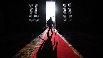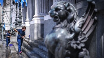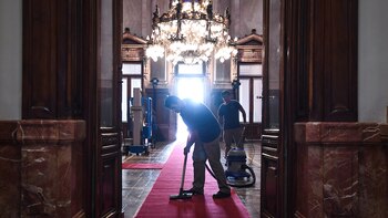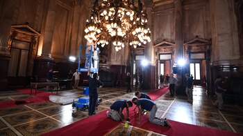 Mientras unos desenrrollan la extensa alfombra roja por donde transitarán los máximas autoridades, otros son los encargados de sellarla al piso. También están los encargados de baldear las escalinatadas de ingreso y los que tienen la misión de chequear que funcionen todas las luces de las arañas que cuelgan de los techos.