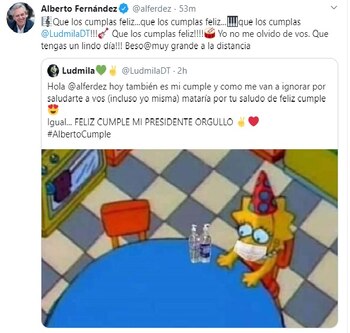 Luego, siguió contestándoles a los que se sumaron con los saludos. Incluso le redactó la letra del feliz cumpleaños a una usuaria de Twitter que también cumple años este 2 de abril y se lo hizo saber en una publicación que estaba acompañada con un meme alusivo a la cuarentena obligatoria. “Que tengas un lindo día, un beso muy grande a la distancia”, le respondió el Jefe de Estado.