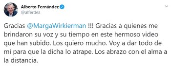 También respondió a una publicación de una militante kirchnerista que subió un video en el que se ven a personas de todo el país saludando al Presidente y enviándole fuerzas en este difícil momento a raíz de la pandemia. “Vamos que salimos entre todos”, reza la publicación acompañada con el hasthag #AlbertoCumple, que se convirtió en tendencia en Argentina. “Gracias a quienes me brindaron su voz y su tiempo en este hermoso video que han subido. Los quiero mucho. Voy a dar todo de mí para que la dicha lo atrape. Los abrazo con el alma a la distancia”, respondió Alberto Fernández a la usuaria @MargaWirkierman.