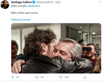 Por otro lado, el jefe de Gabinete, Santiago Cafiero, fue uno de los primeros funcionarios que saludó al Presidente, con un tuit sencillo de una foto de ambos abrazados (algo que ya el distanciamiento obligatorio impide) y una frase: “más unidos que nunca”.