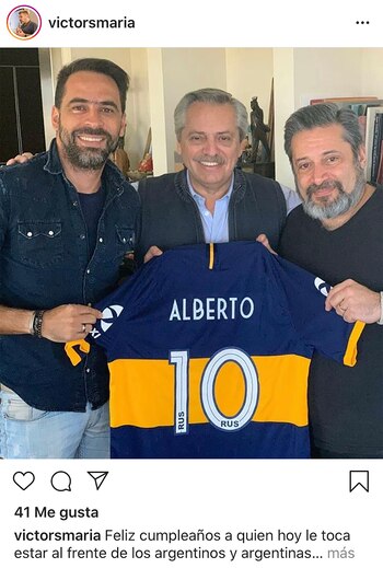 El secretario general del SUTERH y aportante de varios funcionarios que provienen de su espacio político, Víctor Santamaria, posteó una foto junto al Presidente que sostiene la camiseta de Boca con el número 10 y el nombre "Alberto” en la espalda. “Feliz cumpleaños a quien hoy le toca estar al frente de los argentinos y argentinas. No es un momento fácil, pero sin dudas vos y tu equipo lo están llevando adelante de una manera ejemplar”.
