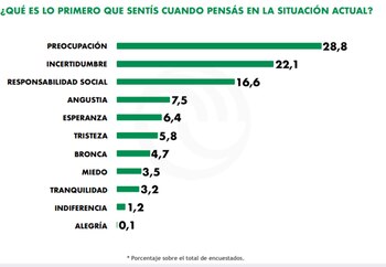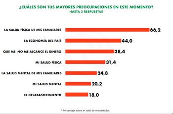 Otro de los datos que aporta el estudio tiene que ver con dónde está concentrada el temor de la mayoría de la gente con respecto al avance del coronavirus. Ante la pregunta sobre cuáles son las mayores preocupaciones que tienen en este momento, el 66,2% contestó que es la salud física de sus familiares, el 44% la economía del país, el 38,4% que no le alcance el dinero para vivir y el 31,4% su propia salud física.