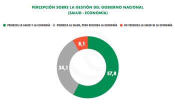 Frente a este escenario de cuarentena, crisis sanitaria y económica, e incertidumbre sobre las costumbres diarias, el 57,8% los habitantes del AMBA percibe que el Gobierno cuida la salud y la economía al mismo tiempo. El 34,1 entiende que prioriza la salud pero descuida la economía, mientras que solo un 8,1 asegura que no cuida ni la salud ni la economía.