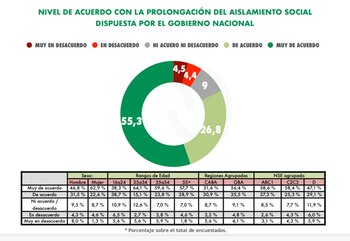 Más allá de los problemas económicos que resaltan la mayoría de los encuestados, más del 82% aprueba la continuidad del aislamiento social dispuesto hasta el 26 de abril. Solo un 9% se mostró en desacuerdo con la decisión que tomó el Presidente el último viernes, cuando anunció la extensión de la cuarentena.